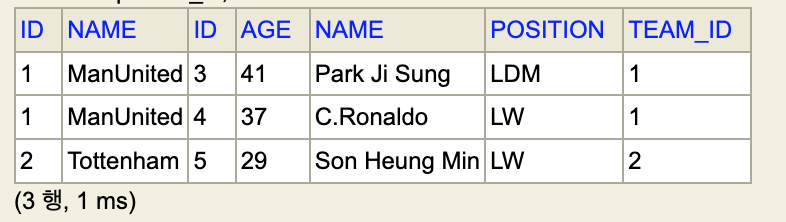 예를 들어서 위는 Fetch Join을 이용한 TEAM과 MEMBER의 조인 결과이다. ManUnited라는 팀이 각각 Park Ji Sung, C.Ronaldo와 매치가되어 2번의 중복된 결과가 나오게 되는 것이다.