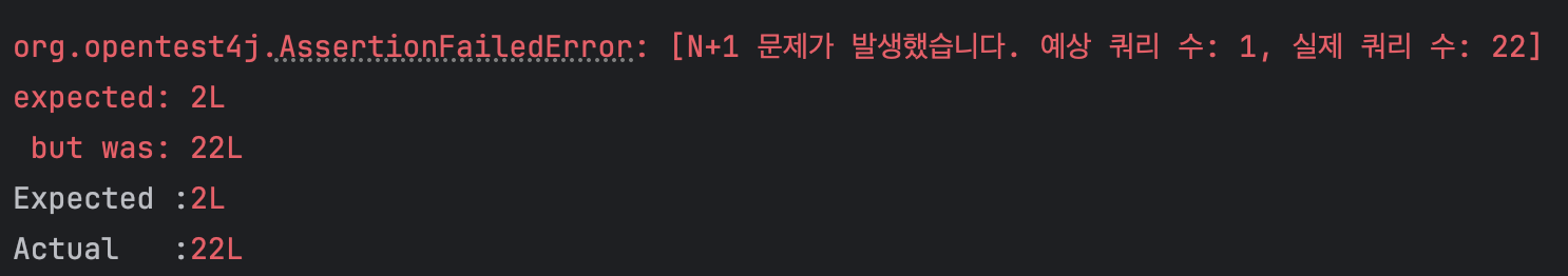 assertThat(queryCount).as("N+1 문제가 발생했습니다. 예상 쿼리 수: 1, 실제 쿼리 수: " + queryCount).isEqualTo(1L);